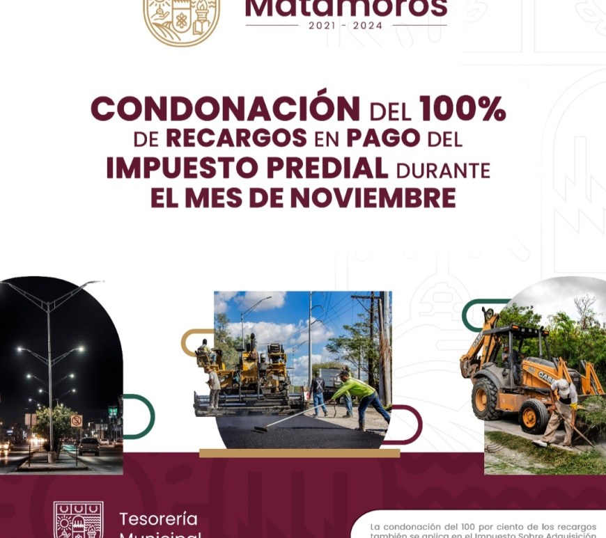 Durante el mes de noviembre, el Gobierno de Matamoros mantiene la condonación del 100 % de los recargos en el pago del Impuesto Predial.Se exhorta a los contribuyentes que mantengan adeudos en este gravámen, que se acerquen a la Tesorería Municipal a regularizar su situación y reciban el citado beneficio autorizado por el R. Ayuntamiento de Matamoros. Continúa leyendo APROVECHE LOS DESCUENTOS DE RECARGOS EN EL PREDIAL DURANTE NOVIEMBRE