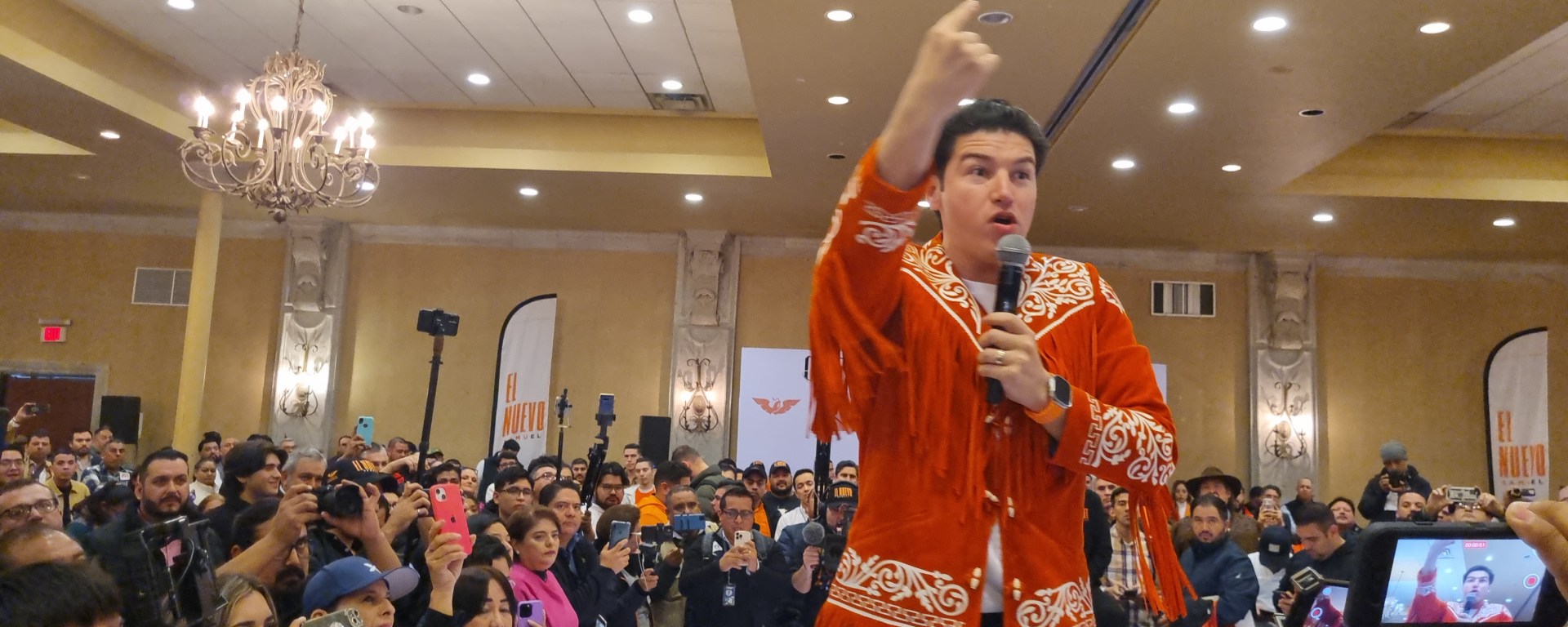 Samuel García Sepúlveda, estuvo acompañado por el dirigente estatal del Movimiento Ciudadano, Juan Carlos Zertuche Romero y el coordinador en Matamoros, Roberto Lee Ponce y su familia quien le regaló una cuera tamaulipeca.