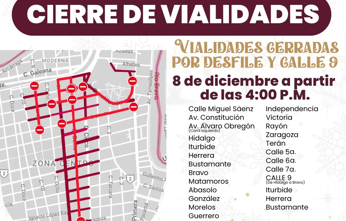 El Gobierno de Matamoros informa a todos los automovilistas, que debido a la realización del desfile navideño, el viernes 8 de Diciembre a partir de las 16:00 horas, varias arterias de la ciudad serán cerradas a la circulación, por este motivo exhorta a circular por vías alternas.