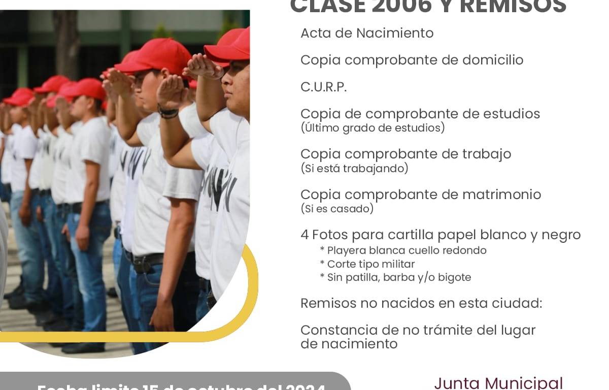 La Junta Municipal de Reclutamiento del Municipio de Matamoros, Tamaulipas invita a todos los jóvenes de la Clase 2006 y Remisos a registrarse para obtener su Cartilla del Servicio Militar Nacional.