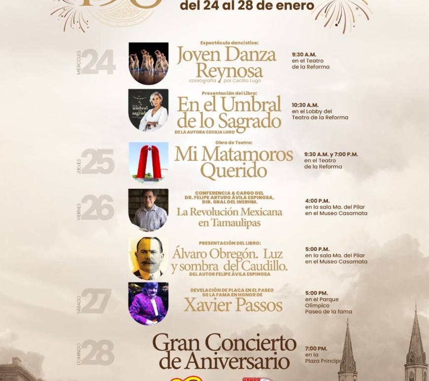 ESTÁN TODOS INVIITADOS La Secretaría de Educación, Cultura y Deporte en coordinación con la Comisión Bicentenario presentó la programación de actividades para festejar el 198 aniversario de Matamoros, rumbo a la celebración de los 200 años de esta Ciudad.“Este Programa es público, ajeno a cualquier partido político. Queda prohibido el uso para fines distintos a los establecidos en el programa”. Continúa leyendo PRESENTA LAS FESTIVIDADES DEL ANIVERSARIO DE MATAMOROS