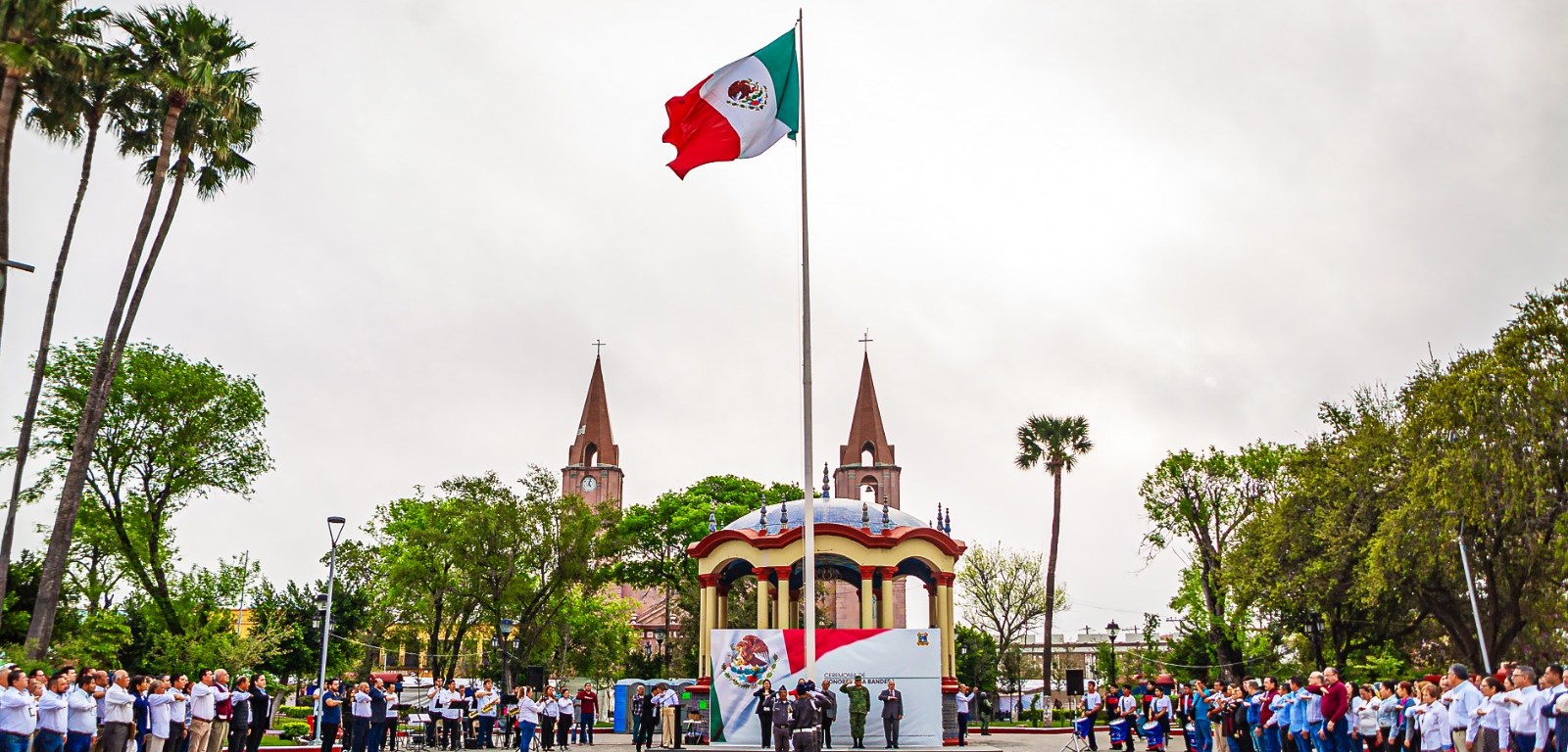 Autoridades municipales, civiles y militares participaron este lunes en la ceremonia de honores a la Bandera organizada por el Municipio de Matamoros a través de la Secretaría de Educación, Cultura y Deporte en coordinación con la Secretaría de Bienestar Social.