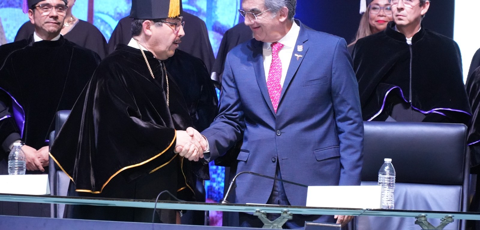 En el marco de la Asamblea Universitaria Solemne realizada en el Gimnasio Multidisciplinario del Campus Victoria, el gobernador felicitó a la comunidad de la máxima casa de estudios por la elección de un rector respaldado por una larga trayectoria universitaria, “un perfil honorable y un consenso que, de forma ejemplarmente democrática, se expresó contundentemente y con una participación muy amplia, lo cual, creo, no tiene precedente”.
