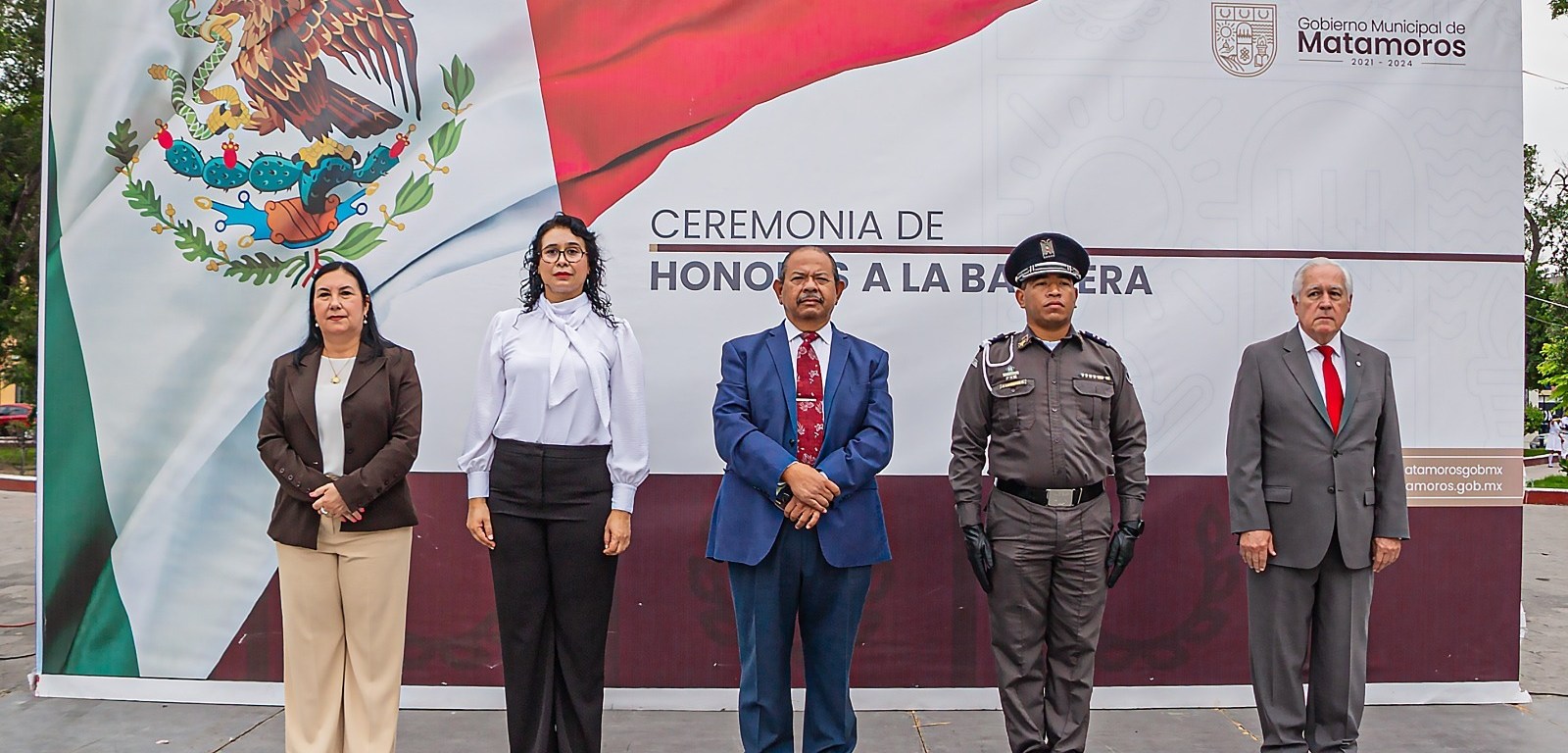 La ceremonia fue encabezada por el Presidente Municipal de Matamoros, Dr. Rubén Sauceda Lumbreras, quien fue acompañado en el presídium por autoridades militares, del Republicano Ayuntamiento y funcionarios municipales.