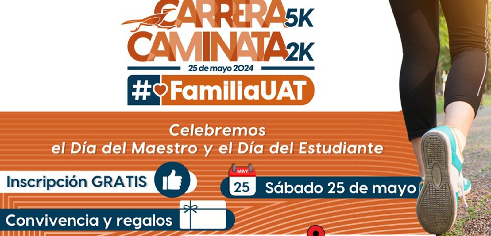 Acompáñanos el próximo sábado 25 de mayo a festejar a los Maestros y Estudiantes, en nuestra Carrera 5K y Caminata 2K, que tendrá recorrido por las principales calles de Cd. Victoria. La Universidad Autónoma de Tamaulipas te invita a participar en este evento que contempla premios en efectivo, rifa de regalos, música en vivo, hidratación, servicio médico, souvenirs y muchas sorpresas. Las inscripciones son gratis y se pueden hacer en las oficinas de Deportes UAT y en el Gimnasio Multidisciplinario UAT Victoria, de lunes a viernes, de 9:00 a 20:00 horas. #FamiliaUAT te invita.