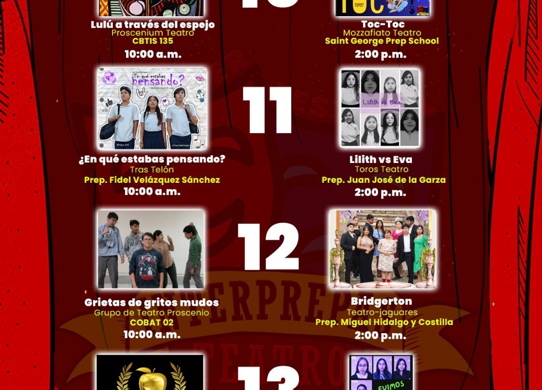 Las obras que se presentarán son las siguientes: el 10 de junio a las 10:00 hrs. El CBTIS 135 presentará la obra “Lulú a través del Espejo”; ese mismo día a las 14:00 hrs. el Saint George Prep School presentará “Toc-Toc Mozzafiato Teatro”.