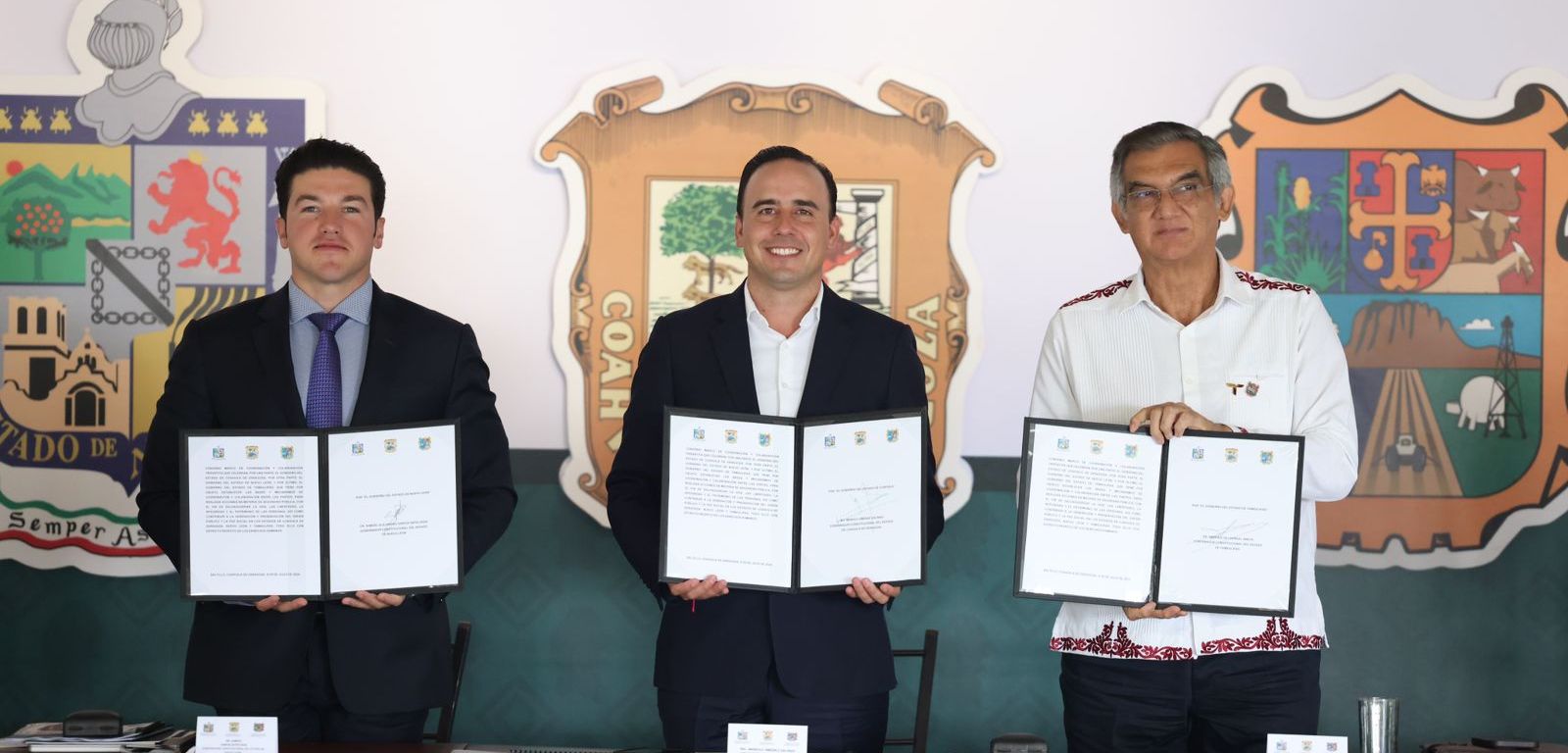 Saltillo, Coahuila.- El gobernador Américo Villarreal Anaya firmó un convenio de coordinación y colaboración en seguridad pública junto a sus homólogos Manolo Jiménez Salinas, de Coahuila y Samuel García Sepúlveda, de Nuevo León.