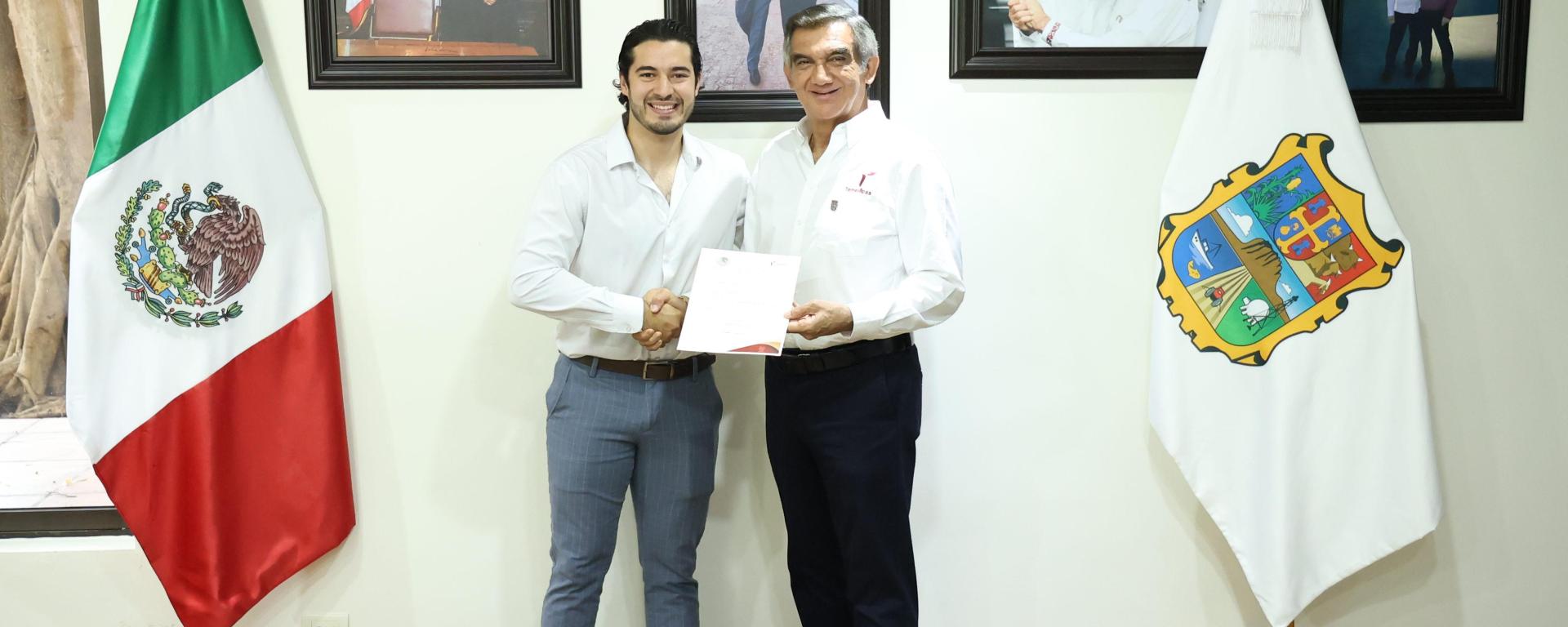 Ciudad Victoria, Tamaulipas.- El gobernador Américo Villarreal Anaya entregó el nombramiento como nuevo secretario del Trabajo y Previsión Social del Gobierno de Tamaulipas a Luis Gerardo Illoldi Reyes, quien ocupará el cargo que dejó vacante la ahora senadora electa, Olga Patricia Sosa Ruíz.