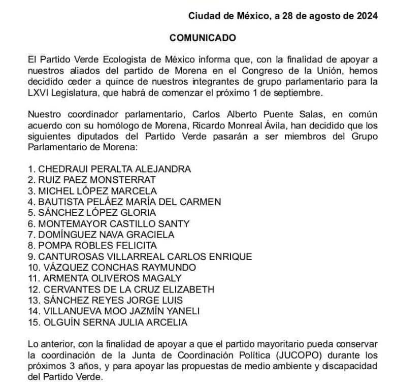 En este caso Mario López Hernández se queda representando el Partido Verde dentro de la fracción parlamentaria, pero no MORENA.