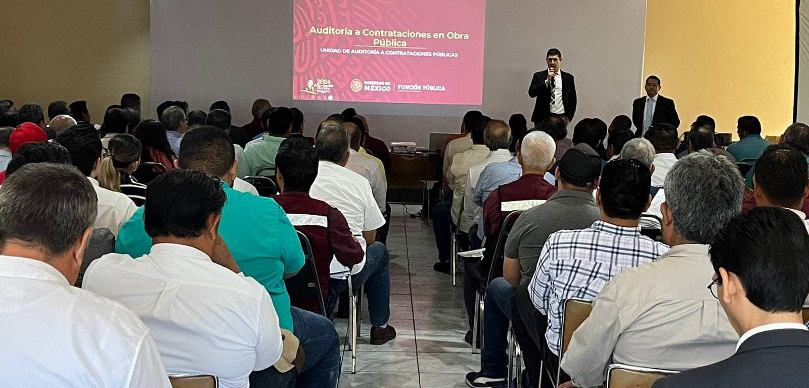 El primer tema se denominó «Auditoría a Contrataciones de Obra Pública» y fue impartido por la Unidad de Auditoría a Contrataciones Públicas, a cargo de León David García Rodríguez y Óscar Armando Reyes González.