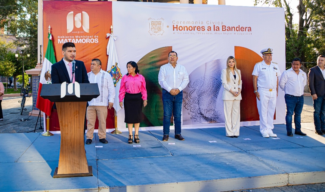 Matamoros, Tamaulipas. a 14 de octubre.- El alcalde Alberto Granados Fávila encabezó este lunes los honores a la bandera, un evento organizado por la Secretaría de Educación, Cultura y Deportes, que representa Yolanda Chavira Estrada.