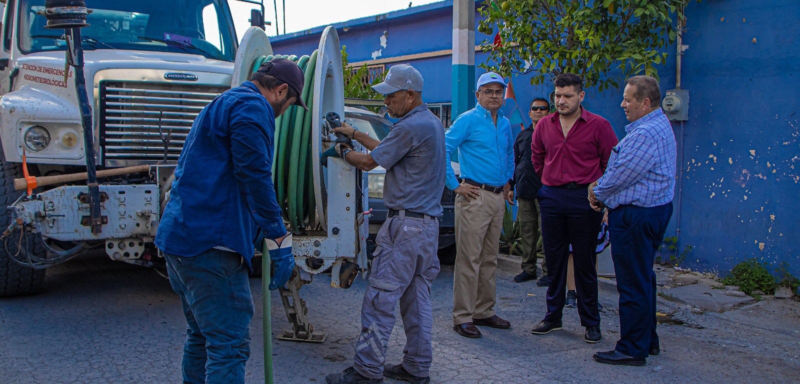 Durante el recorrido, el alcalde constató el uso de camiones vactor, equipo especializado para la limpieza y mantenimiento del sistema de drenaje, con el objetivo de prevenir inundaciones y mejorar el flujo en las redes de agua y drenaje de la ciudad.