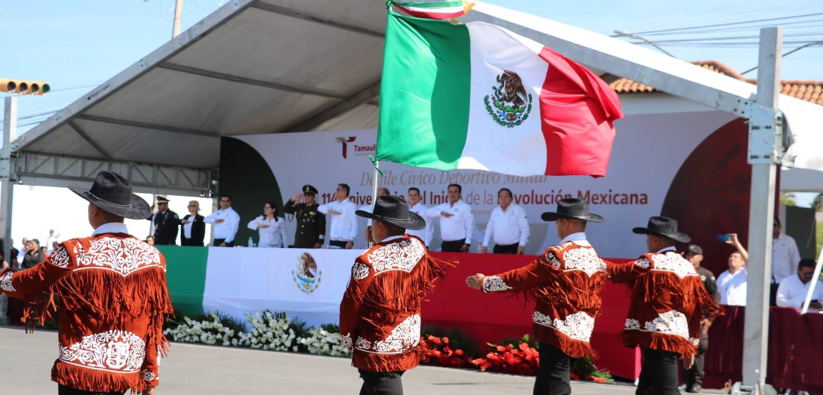 Acompañado por el general DEM Enrique García Jaramillo, comandante de la 48ª Zona Militar, el gobernador Américo Villarreal atestiguó, por espacio de casi cuatro horas, el paso de los contingentes llenos de colorido, música tradicional mexicana y atuendos revolucionarios, todos ejecutando sus rutinas, tablas gimnásticas, pirámides monumentales y evoluciones ante el aplauso de los miles de familias congregadas a lo largo del bulevar Tamaulipas, de esta capital.