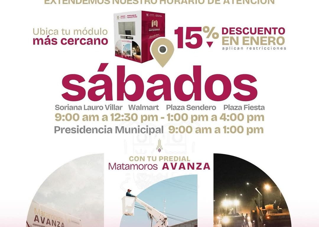 El Ayuntamiento de Matamoros anuncia que los sábados está a disposición las cajas para el pago del impuesto predial con todo y descuento.