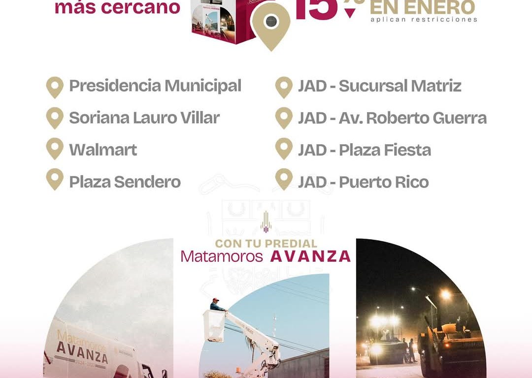matamorosAproveche el descuento en los recargos del impuesto predial El Ayuntamiento de Matamoros pide a los contribuyentes aprovechar el descuento a los recargos del impuesto predial. Compártelo: Haz clic para compartir en X (Se abre en una ventana nueva) X Haz clic para compartir en Facebook (Se abre en una ventana nueva) Facebook Me gusta Cargando... Relacionado