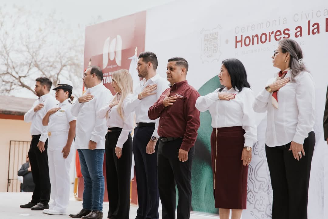 Matamoros, Tamaulipas.- El alcalde de Matamoros, Alberto Granados Fávila, encabezó la ceremonia de honores a la bandera en la primaria María Isabel Mata Alvarado, donde además supervisó la obra de una aula de usos múltiples, reforzando su compromiso con la educación en el municipio.