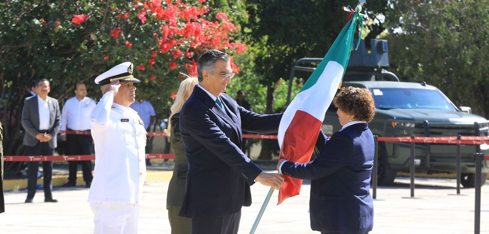 Tras abanderar a las escoltas de cinco escuelas primarias, Américo Villarreal recordó́ que la bandera fue estandarte de identidad de los insurgentes y recoge el tributo necesario a nuestros pueblos originarios.