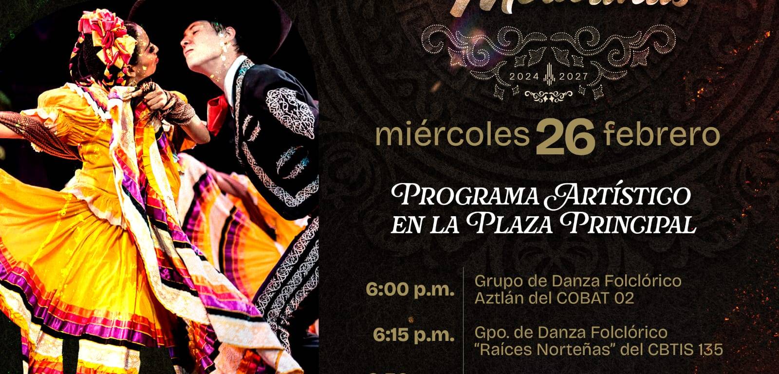 Hoy, se contará con la participación de diversas instituciones educativas que presentarán un interesante programa cultural. A las 18:00 horas, el grupo de danza folklórico Aztlán del Cobat 02 ofrecerá una presentación. A las 18:15 horas, será el turno del grupo de danza folklórico «Raíces norteñas» del CBTIS 135. Posteriormente, a las 18:30 horas, se podrá disfrutar del grupo musical J30. Finalmente, a las 17:30 horas, se presentará el Grupo de danza Quetzalcóatl, del ITACE.