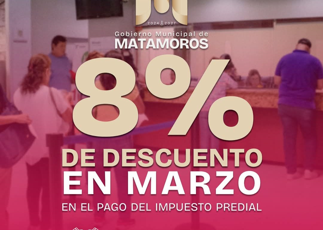 H.Matamoros, Tamaulipas.- Durante marzo, el Gobierno de Matamoros ofrece un descuento del 8% en el pago del impuesto predial para los ciudadanos que se encuentren al corriente en sus contribuciones.