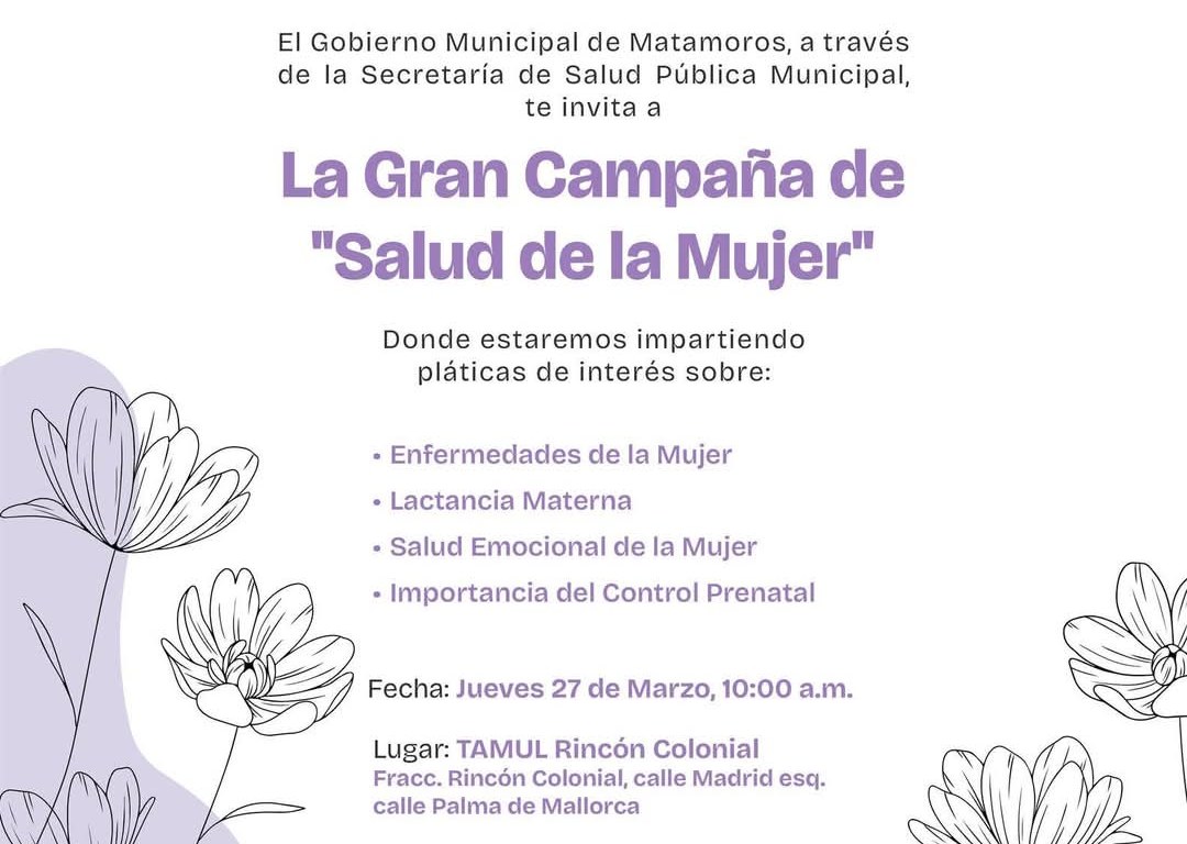 H. Matamoros, Tamaulipas. – La salud es bienestar, y como parte de la Gran Campaña de Salud de la Mujer, se llevará a cabo una jornada informativa sobre diversos temas de interés.