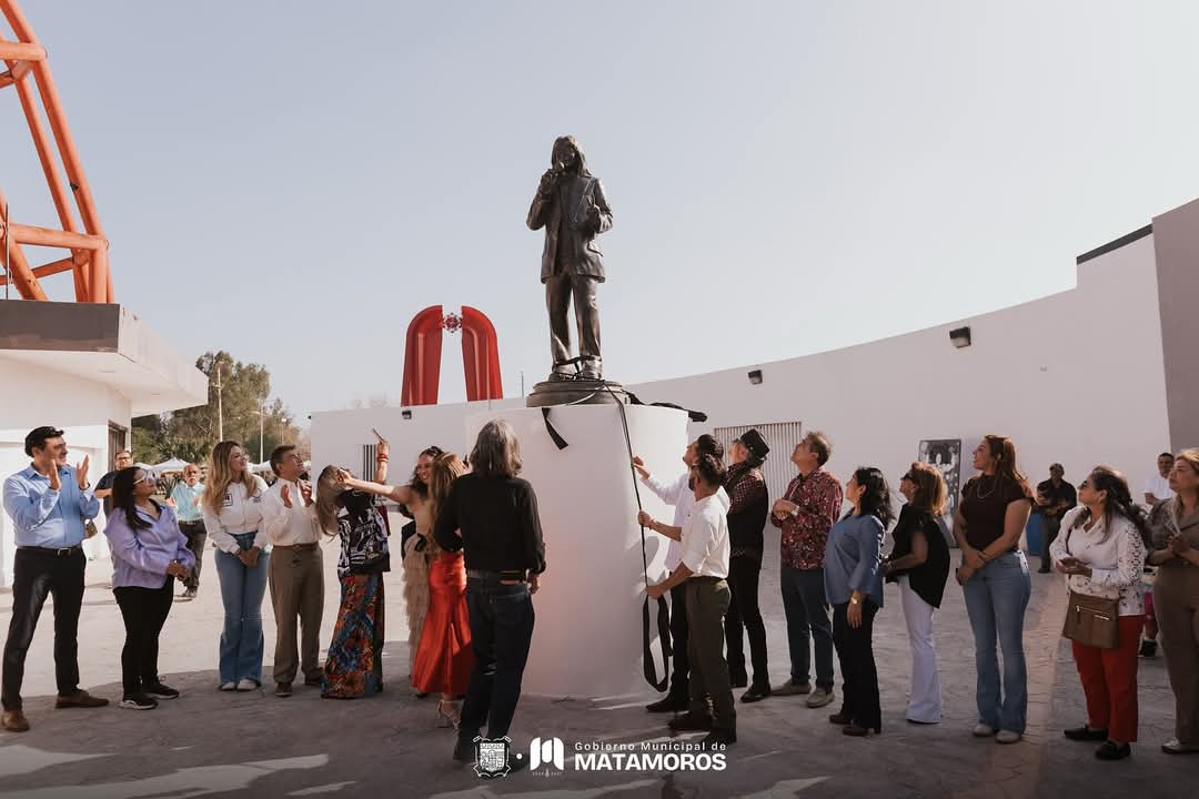H. Matamoros, Tamaulipas.- En un emotivo acto, el alcalde Beto Granados junto a Isabel Martínez, viuda del icónico Rigo Tovar, develaron hoy la estatua en honor al famoso cantante y compositor, ubicada frente al Museo de Rigo Tovar. Esta estatua fue previamente removida de la avenida que lleva su nombre, marcando un nuevo capítulo en la celebración de su legado.