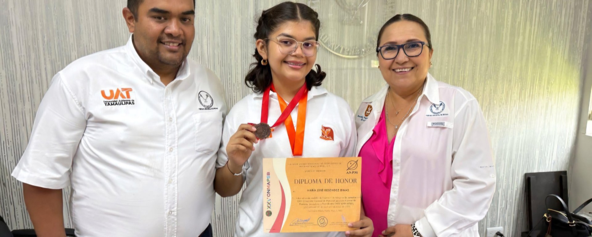 A través de sus redes sociales, el rector de la UAT, Dámaso Anaya Alvarado, felicitó a María José, alumna del segundo semestre de la Escuela Preparatoria Mante, por su excelente rendimiento académico que le permitió obtener la medalla de bronce en esta competencia nacional.