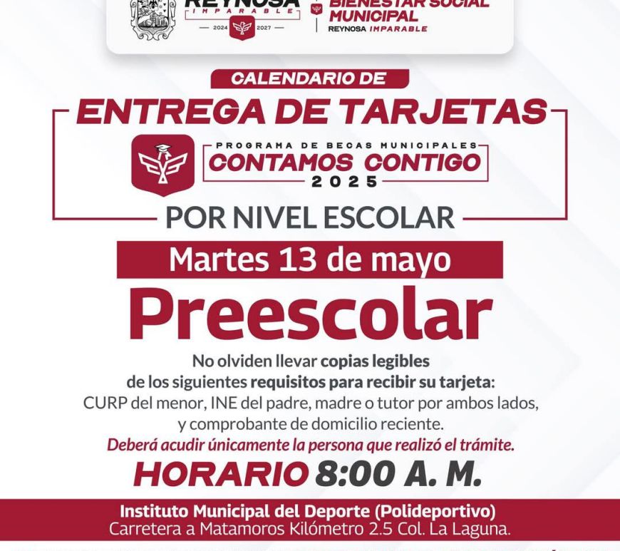 Este martes 13 de mayo, padres o tutores de estudiantes de preescolar, tienen una cita con el Alcalde Carlos Peña Ortiz, para recibir las tarjetas del Programa de Becas Más Grande en la Historia de Reynosa, que apoya la educación inicial para que los niños transiten con seguridad por el camino del éxito. La entrega de las tarjetas del Programa de Becas Municipales «Contamos Contigo» … Continúa leyendo Entregará Carlos Peña Ortiz Becas de Preescolar este martes 13 de mayo