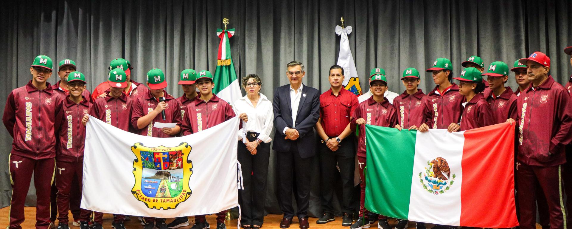 Ciudad Victoria, Tamaulipas.- El gobernador de Tamaulipas, Américo Villarreal Anaya, encabezó la ceremonia de abanderamiento del equipo de la Liga Villa del Refugio de Matamoros A.C., escuadra campeona nacional de la categoría Junior, perteneciente al programa oficial de Little League (Williamsport) y con ello dicho equipo representará a México en el Torneo Latinoamericano, a celebrarse en Guatemala a partir del próximo sábado.