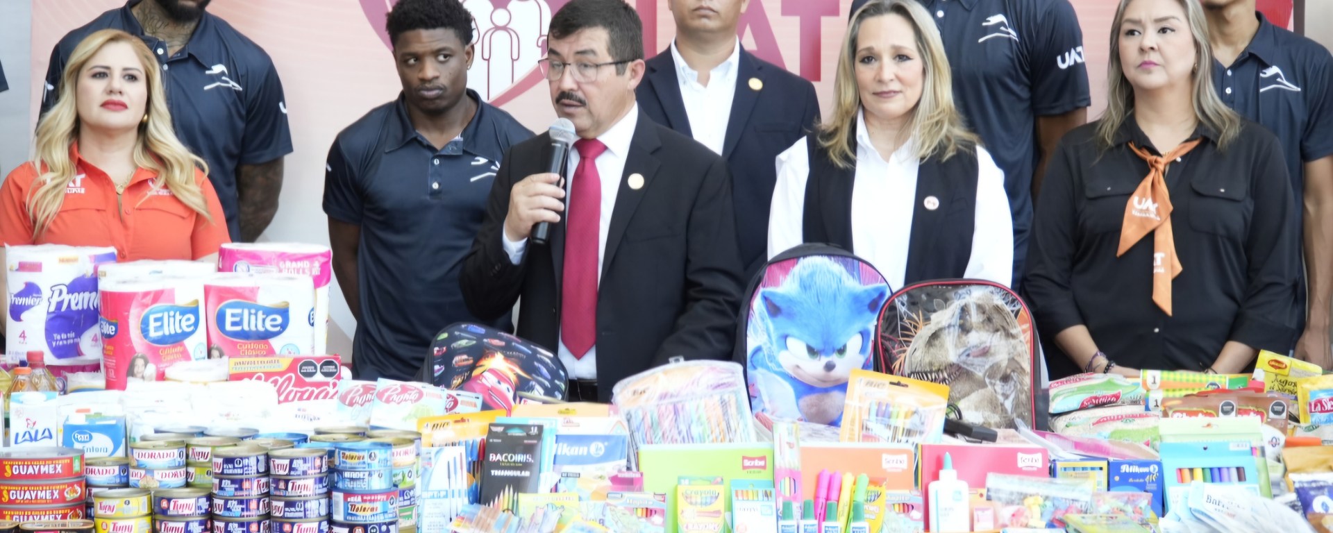 El rector de la Universidad Autónoma de Tamaulipas, Dámaso Anaya Alvarado, acompañado de su esposa, la Lic. Isolda Rendón de Anaya, presidenta de Familia UAT, recibió, del Club Correcaminos de basquetbol profesional (Correbasket), un donativo de víveres y útiles escolares recaudados por el equipo durante sus encuentros en el Gimnasio Multidisciplinario de Victoria, dentro de la Temporada 2025 de la Liga Caliente MX LNBP.