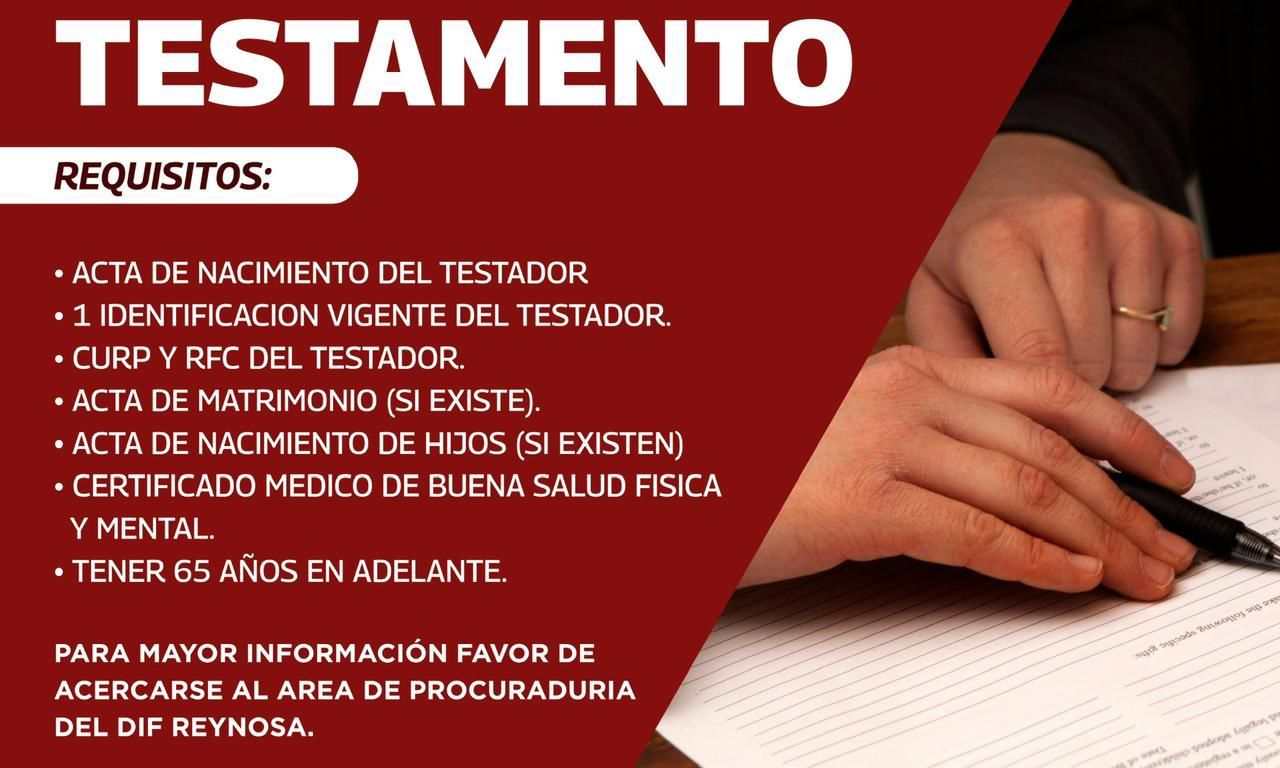 El Sistema DIF-Reynosa que preside Carlos Luis Peña Garza y el Voluntariado que encabeza Alejandra Yelitza Garza, invitan a la población de 65 años en adelante a participar en la Campaña de Testamento, una iniciativa que busca promover la cultura de la previsión y fortalecer la seguridad jurídica de las familias.