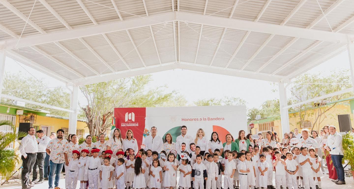 H. Matamoros, Tamaulipas.- El alcalde Beto Granados encabezó la ceremonia de Honores a la Bandera en el Jardín de Niños Estefanía Castañeda, donde además inauguró la nueva techumbre destinada a proteger a la comunidad escolar de las inclemencias del tiempo. La directora del plantel, María Teresa Ruiz, dio la bienvenida al mandatario municipal y expresó un profundo agradecimiento por la obra que, afirmó, representa una mejora significativa para las actividades pedagógicas, físicas y culturales de los alumnos.