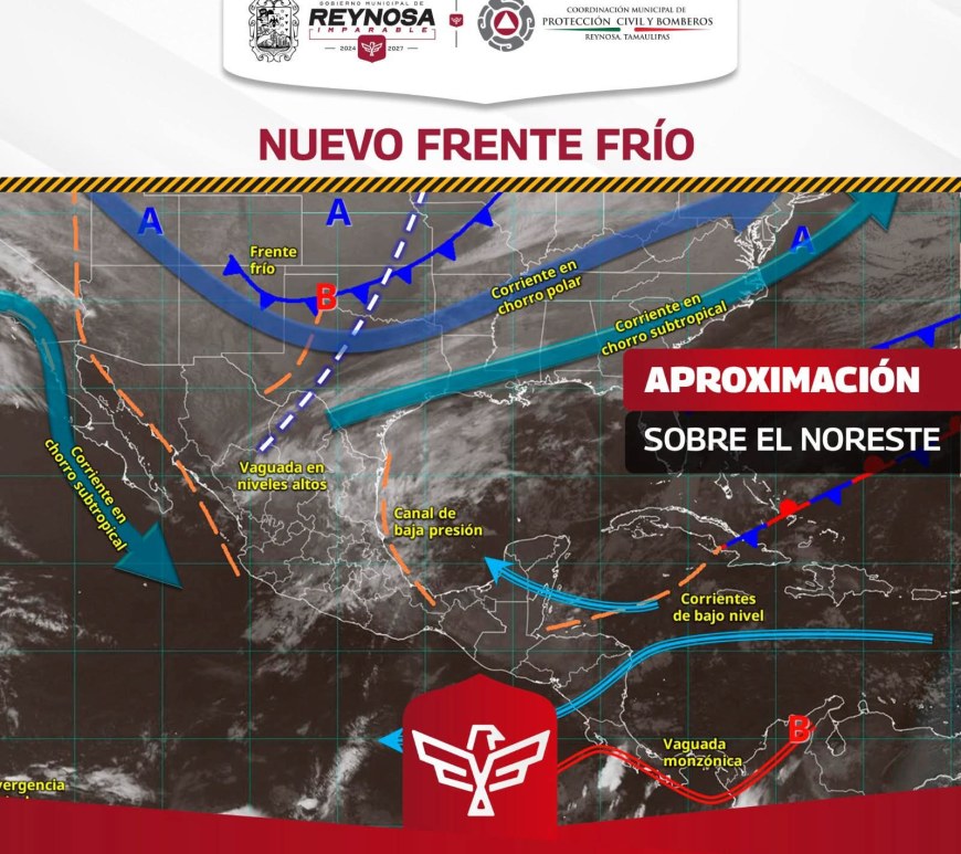 El frente frío que se aproximaba a la frontera norte y noreste del país continuó su desplazamiento, dejando de afectar al territorio nacional. No obstante, el Servicio Meteorológico Nacional vigila la aproximación de un nuevo frente frío a la frontera norte del país. Para Reynosa, una vaguada en niveles altos de la atmósfera, en interacción con la corriente en chorro subtropical y la inestabilidad atmosférica, … Continúa leyendo Se prepara Gobierno de Reynosa para el frente frío