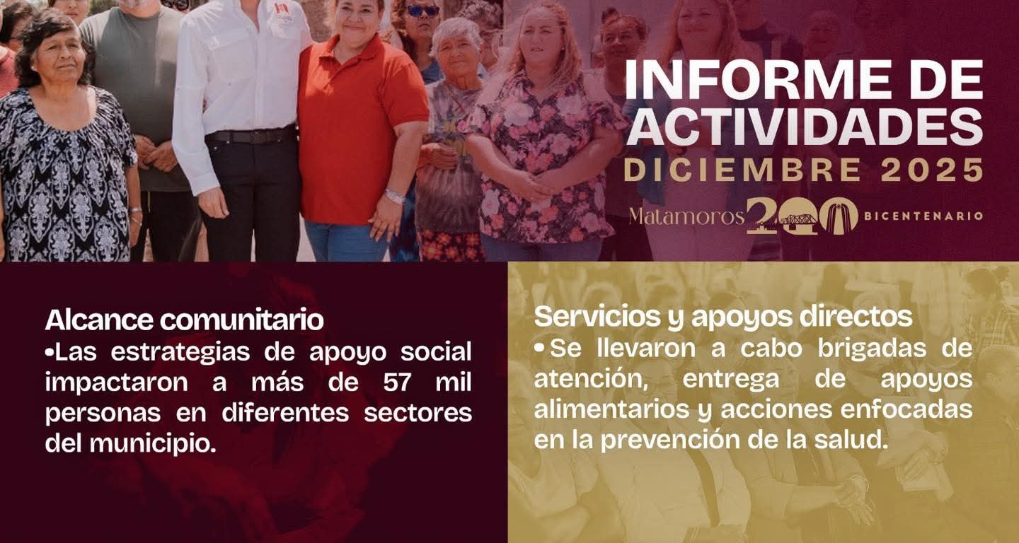 Matamoros, Tam.– Durante el mes de diciembre, el Gobierno Municipal de Beto Granados, a través de la Secretaría de Bienestar Social, amplió su alcance comunitario mediante estrategias de apoyo social que beneficiaron a más de 57 mil personas en distintos sectores del municipio, como parte de una política pública orientada a mejorar la calidad de vida de la población.