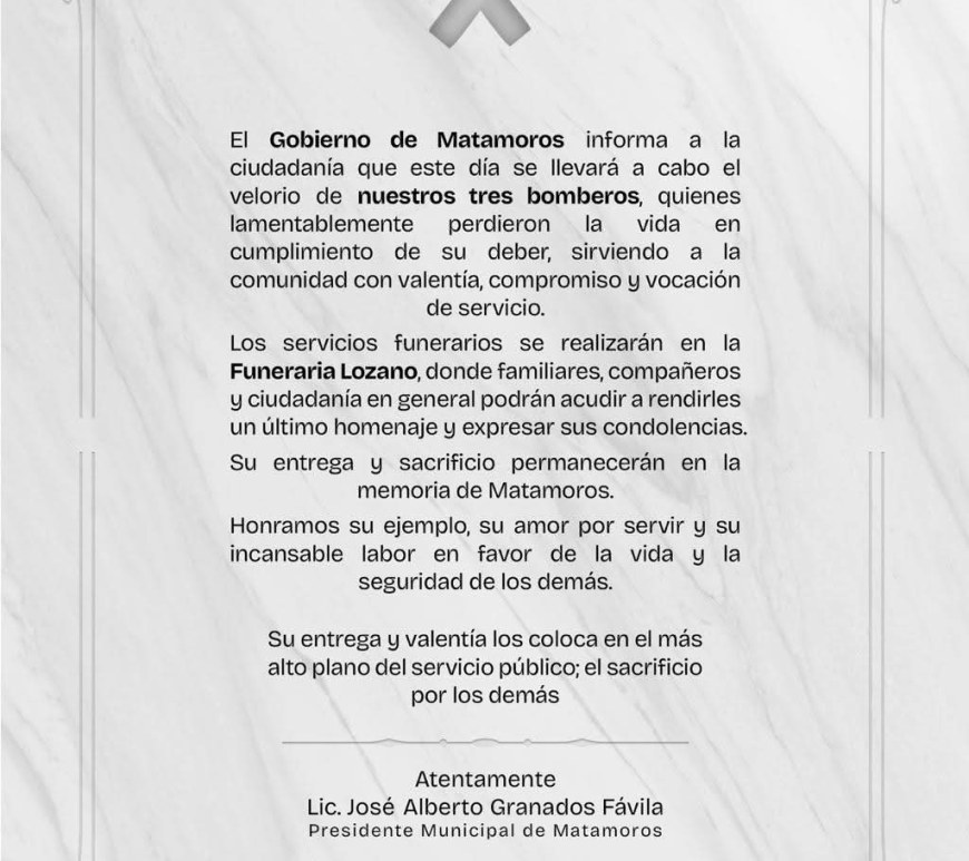 H. Matamoros, Tamaulipas.- Con profundo respeto y dolor, el Gobierno de Matamoros, encabezado por el alcalde Beto Granados, informa que la ciudad despide a tres hombres cuya valentía, entrega y vocación de servicio dejaron una huella imborrable en la historia y el corazón de la comunidad. Carlos Emmanuel Hernández, Ángel Gustavo Acuña Hernández y Osvaldo Xavier Cedillo perdieron la vida en el cumplimiento de su … Continúa leyendo Gobierno de Beto Granados informa hora y servicios fúnebres de los tres bomberos caídos en cumplimiento del deber