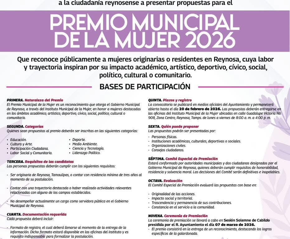 El Gobierno Municipal de Reynosa, que encabeza el Alcalde Carlos Peña Ortiz, a través del Instituto Municipal de la Mujer en Reynosa , busca reconocer a mujeres reynosenses cuya labor y trayectoria han impactado en la transformación de nuestra sociedad.