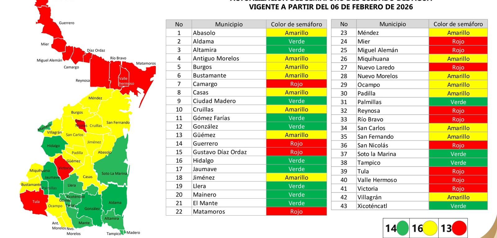 En color rojo permanecen: Camargo, Guerrero, Gustavo Díaz Ordaz, Matamoros, Mier, Miguel Alemán, Nuevo Laredo, Reynosa, Río Bravo, San Nicolás, Tula, Valle Hermoso y Victoria.
