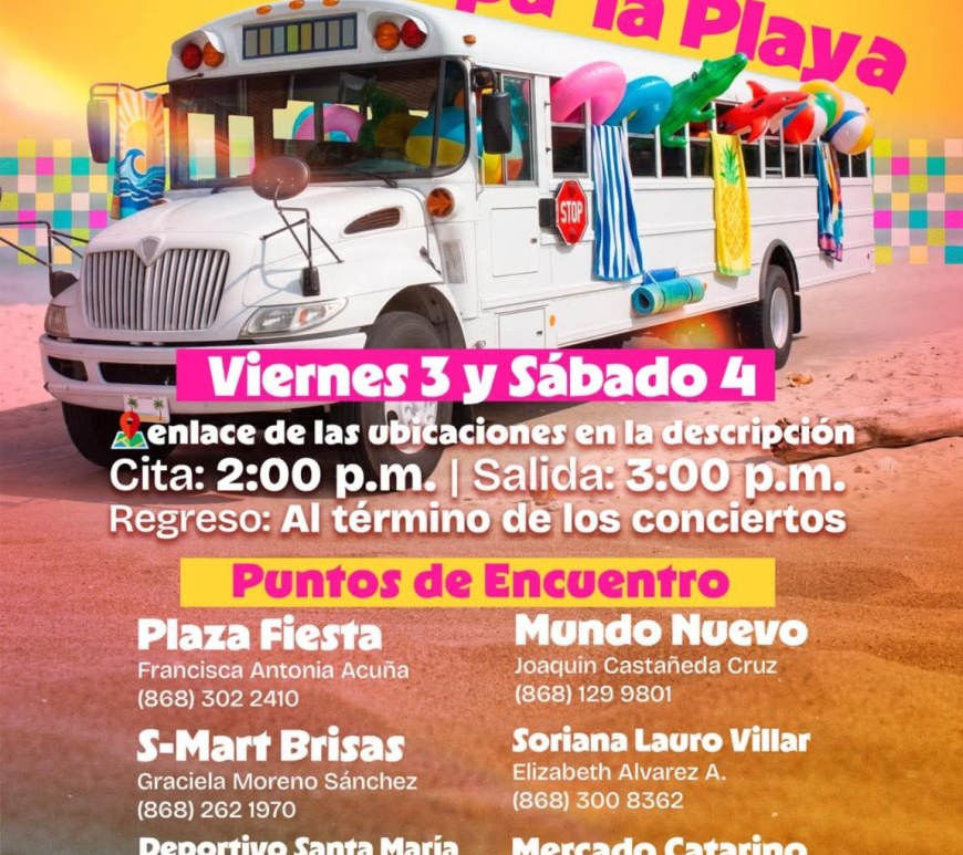 El Gobierno Municipal te invita a disfrutar de este fin de semana con transporte totalmente gratuito Viernes 3 y sábado 4 Consulta el enlace de ubicaciones en la descripción ⏰ Cita: 2:00 p.m. | Salida: 3:00 p.m.Regreso: al término de los conciertos Puntos de encuentro:• Plaza Fiesta• Mundo Nuevo• S-Mart Brisas• Soriana Lauro Villar• Deportivo Santa María• Mercado Catarino Puntos de encuentro https://www.google.com/maps/d/u/0/edit?mid=1PkhgyUYbb9qnsUQcTOJs_-RycbNvrYs&usp=sharing No olvides … Continúa leyendo ¡Todos pa’ la playa!