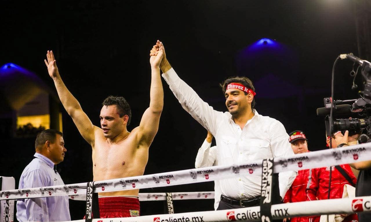 El Presidente Municipal Carlos Peña Ortiz acompañado por el Campeón Mundial Julio César Chávez expresó al boxeador profesional Julio César Chávez Jr, su felicitación por el triunfo obtenido al derrotar en el ring, por nocaut técnico, al colombiano Jhon Caicedo, en el parque de beisbol Adolfo López Mateos que recibió a más de 10 Mil aficionados.